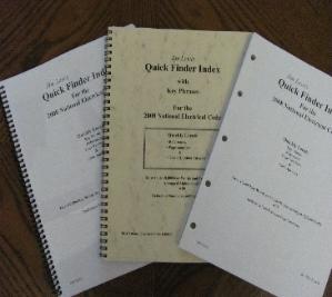 | Quick Finder Index for the National Electrical Code With Formula and Format Pages Find the Answers Fast! Locate the difficult to find references and answers quickly. Key Words and Phrases arranged alphabetically with references and page numbers. Greatly increases your speed by getting you familiar with the hard to find code references. Expanded and detailed for easy reading. Simply the best tool available for use with the National Electrical Code Book Nothing else on the market is as up to date and complete. Contains more than 10,000 key words and Electrical Formulas and Calculation Format inserts. Available for use with the Looseleaf . Spiral Bound and Soft Cover NEC and for use as a reference book. 85 pages, 2 Columns per page. 2011 Quick Finder Index$16.00 + $4.00 Priority Mail Shipping 2014 Quick Finder Index $18.00 + $5.00 Priority Mail Shipping 2017 Quick Finder Index $18.00 + $5.00 Priority Mail Shipping |